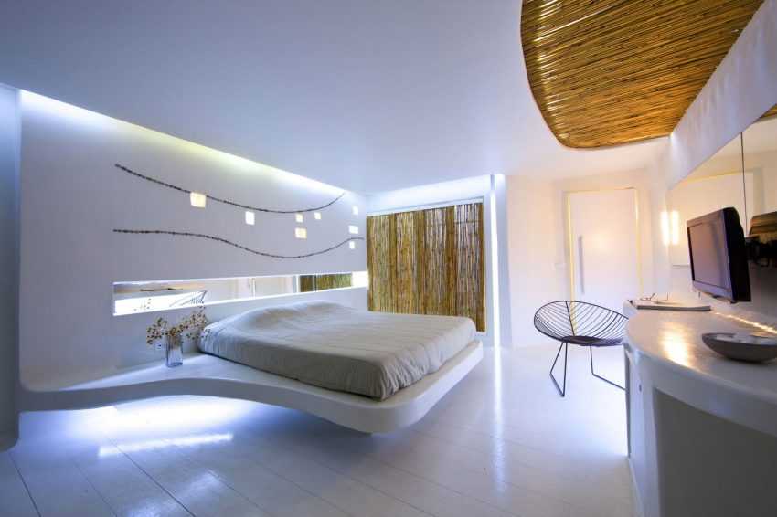 - гипсокартонные — сооружение с подсветкой необычной формы или оригинальным рисунком из этого материала способно подчеркнуть индивидуальность владельца спальни, а композиционным центром будет выступать поверхность над кроватью.