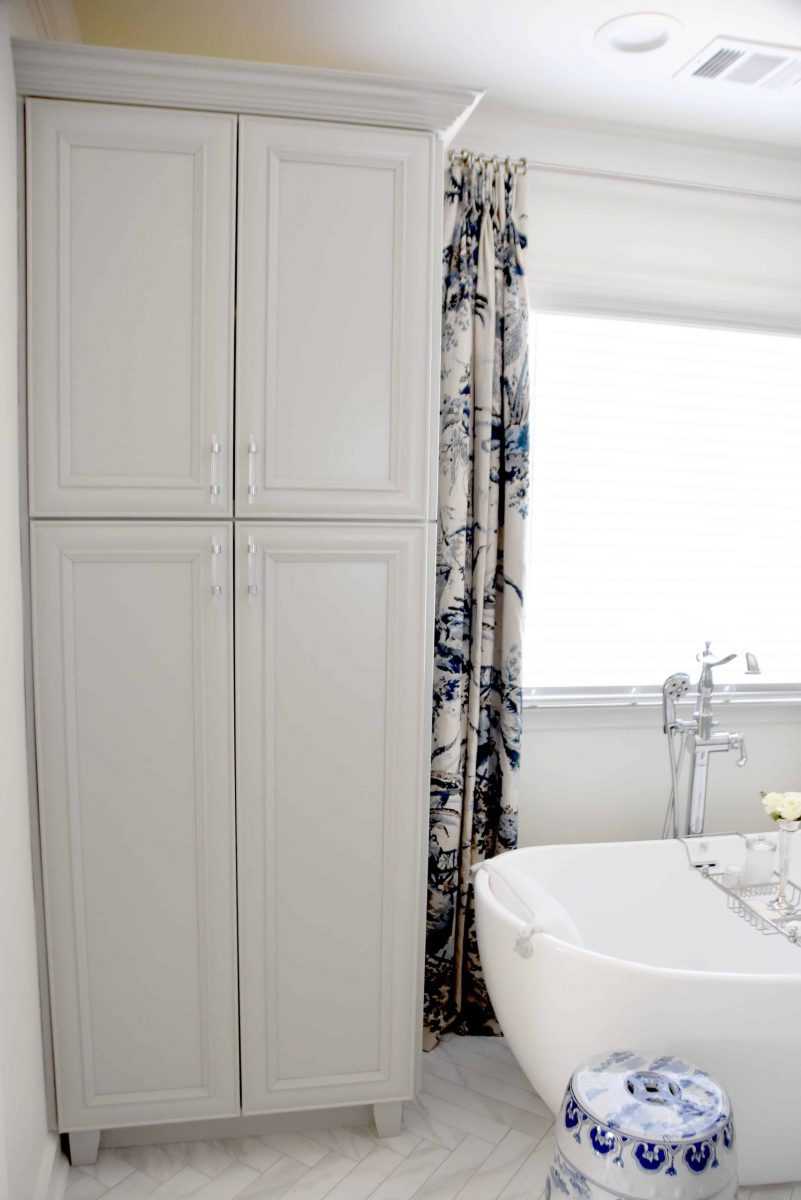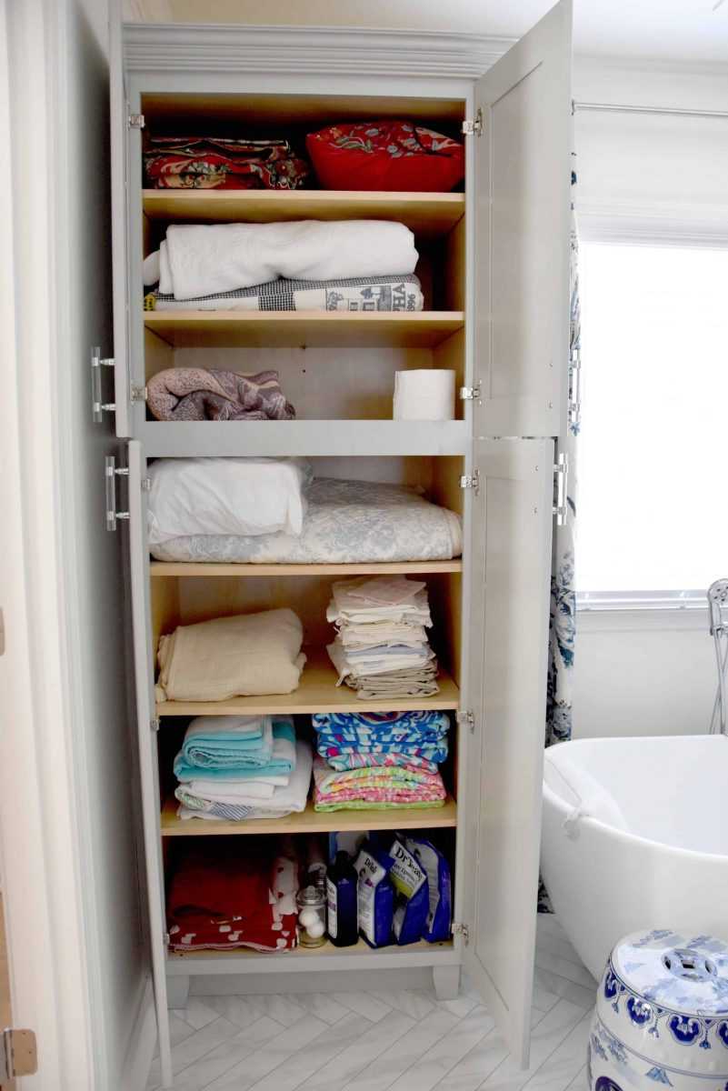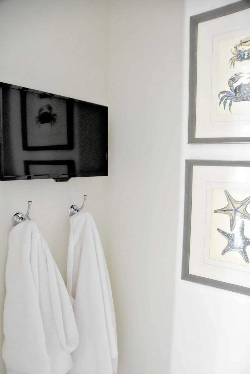 Узкий и высокий шкаф — еще одна экономящая место идея. Он не занимает много места, но предлагает достаточно для хранения маленьких кремовых тюбиков, полотенец или милых декоративных предметов. Другой идеей для небольших ванных комнат, которые используются несколькими людьми, является применение настенных крючков, при этом помещение не выглядит перегруженным.