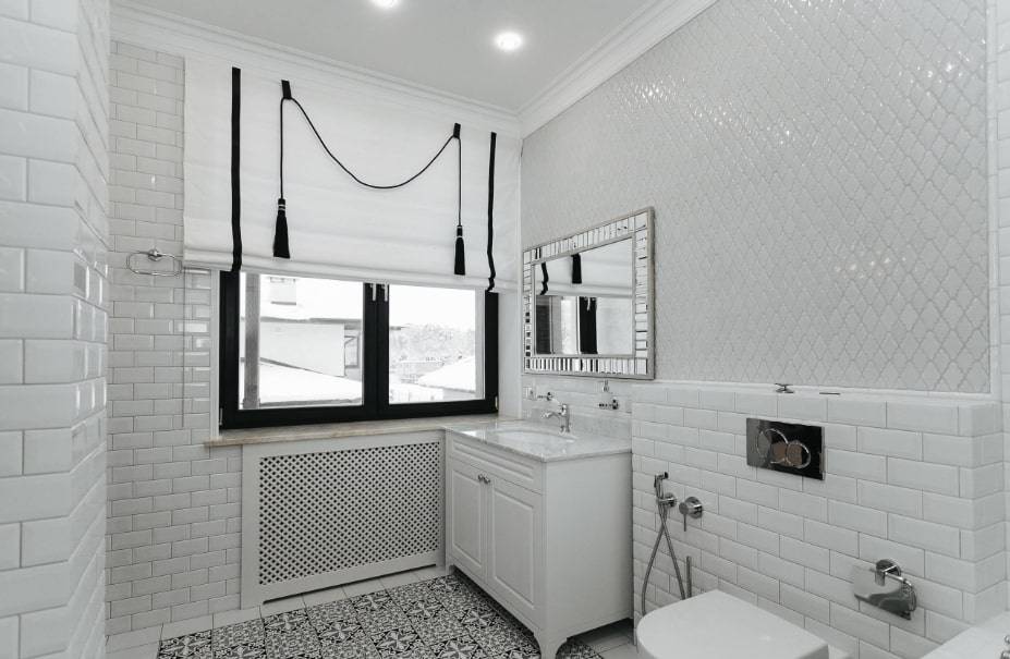 Внимание заслуживает ванная в классическом черно-бело-сером решении. Это прекрасная база для ярких деталей