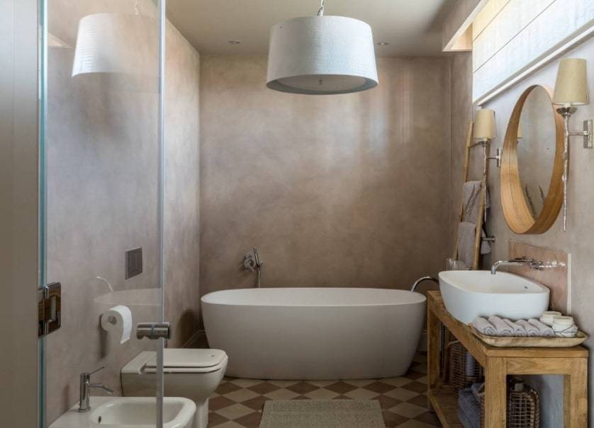 Если в античную эпоху такая обстановка создавалась по объективным причинам, то сегодня ее можно использовать в декоративных целях. Остается лишь ловко обыграть эту тему, например, установив не стандартную ванну, а римскую, то есть большого размера, с очень высокими бортами, прямоугольным орнаментом по краям и фигурами олимпийских богов.