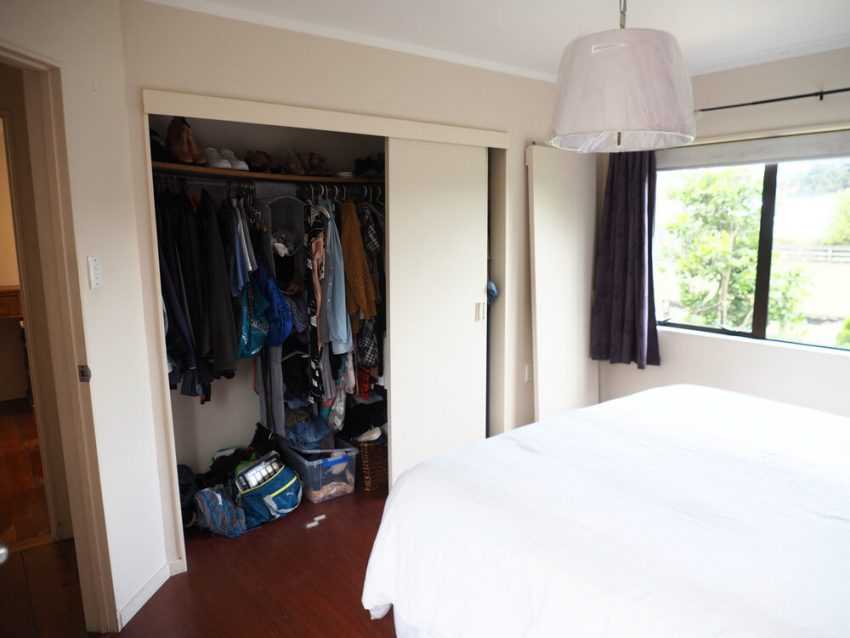 Зачастую комната отдыха предполагает наличие шкафов для хранения одежды. Вместительный гардероб, совмещённый с зоной для сна — популярное решение. Оба помещения выполняются в едином стиле, при этом гардероб отделяется раздвижными перегородками или стандартной дверью.