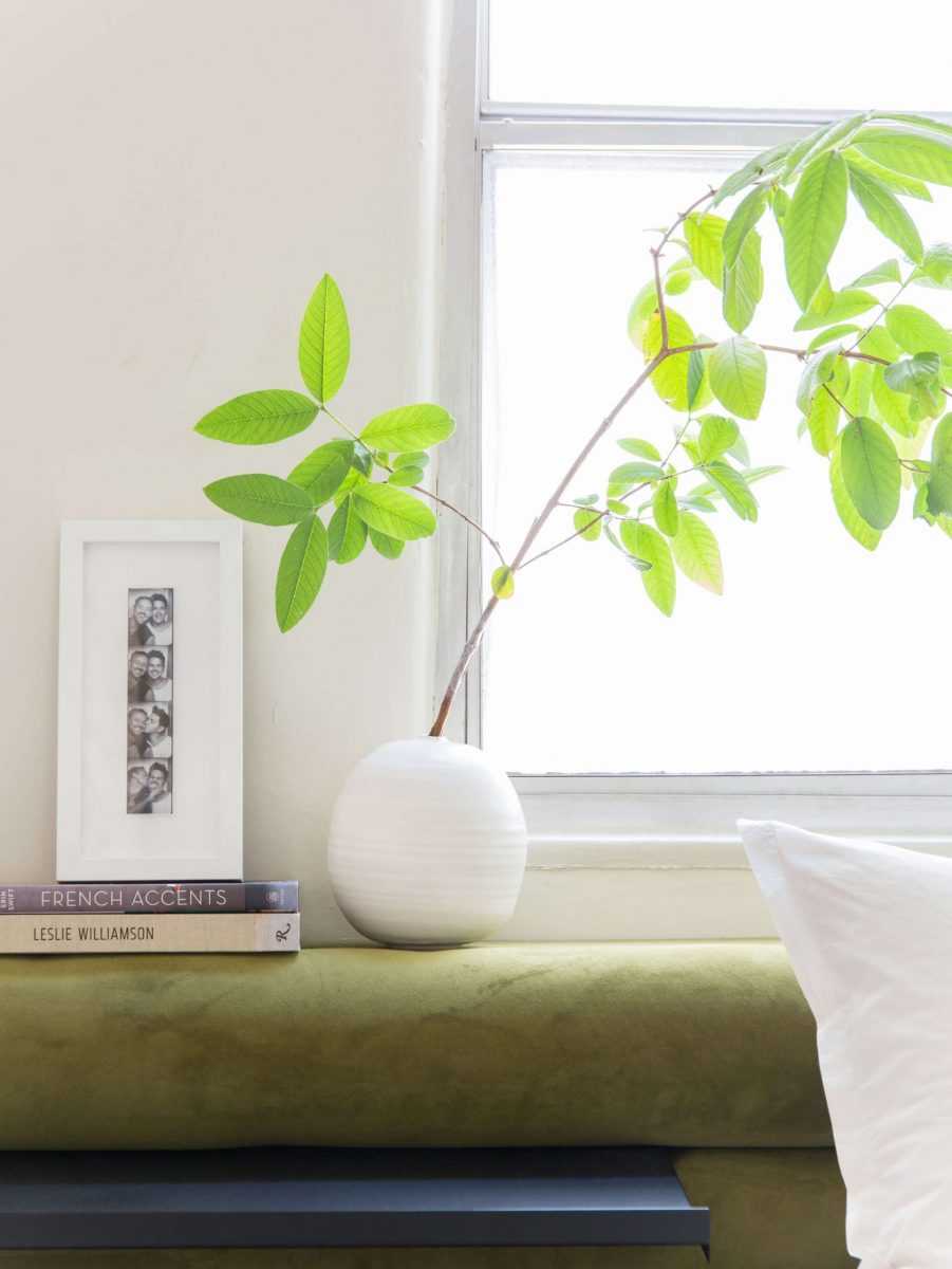 По фото уютной спальни видно, что особая обстановка формируется в результате использования живых растений. Это могут быть горшки с цветами или срезанные букеты. При этом растения используют в минимальном количестве. При выборе букета ориентируются на стилистику, цветовую гамму помещения. Желательно исключить сильно пахнущие экземпляры.