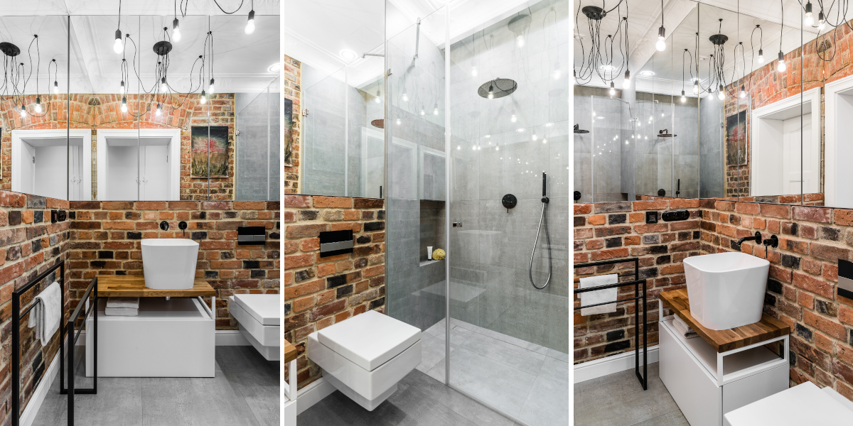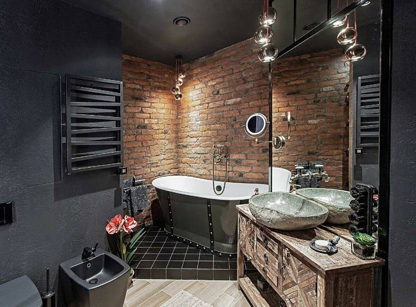 Главными отделочными материалами, использующимися для декорирования стен ванной комнаты в стиле лофт, являются: