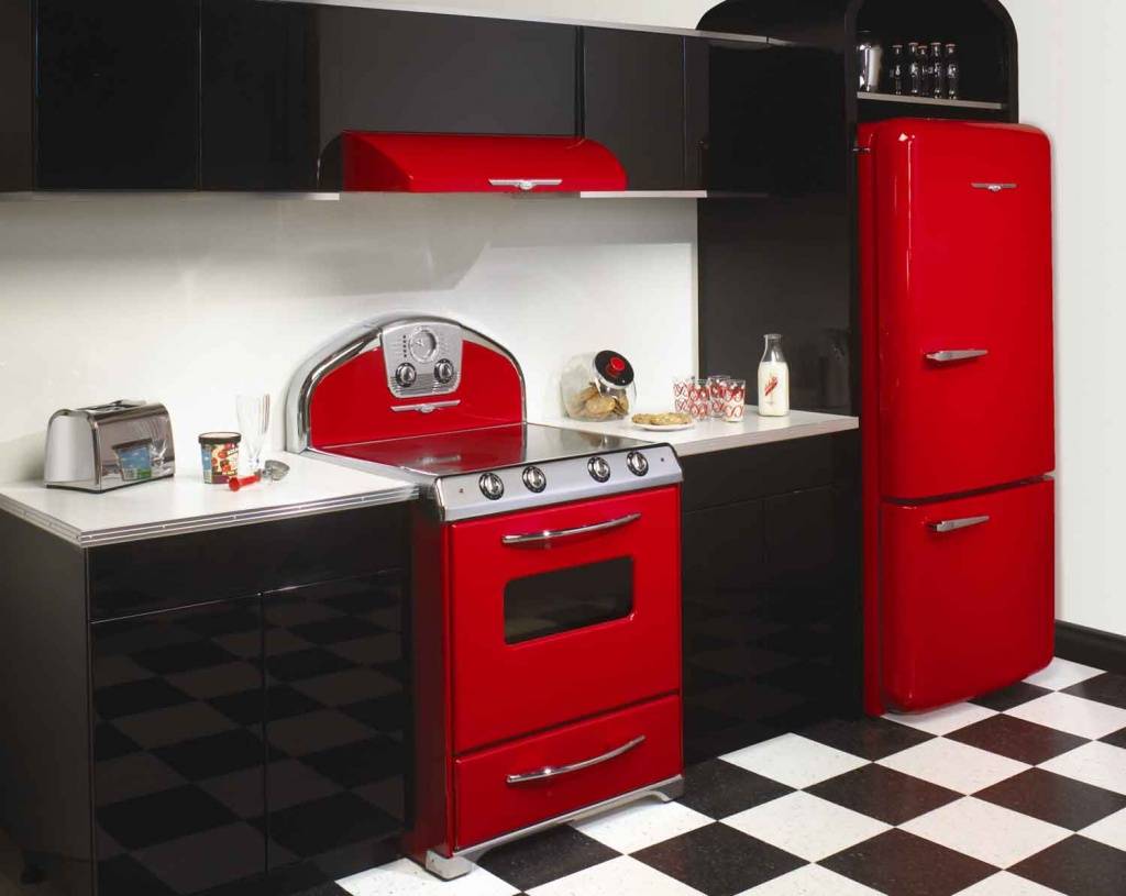 На кухне ретро стиля уместен модный в послевоенное время шахматный пол.