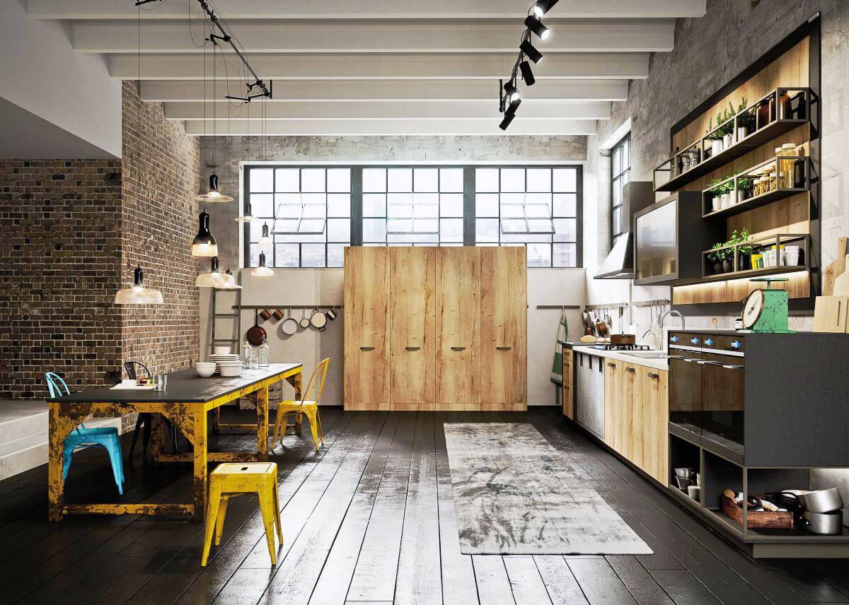 Грубое оформление стен, открытые потолочные балки и дощатый пол – основные признаки индустриального направления.