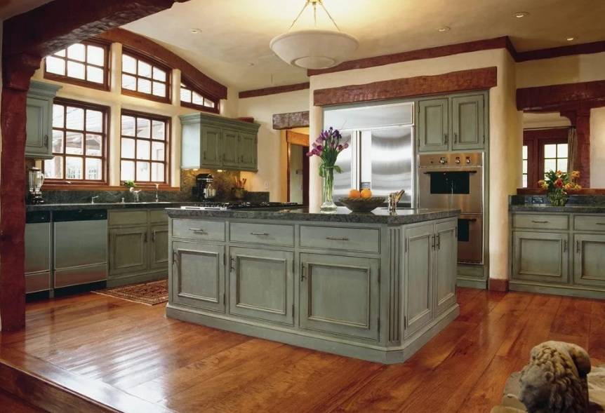 Отличительная черта кухни в стиле “старая Англия” – массивный стол посередине, часто со столешницей из натурального камня.