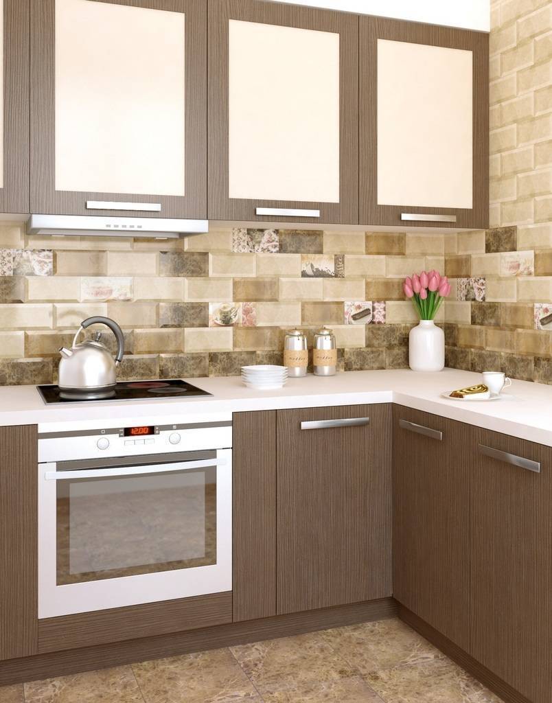 Подобрать декор фартука можно в тон столешнице или в тон фасадам