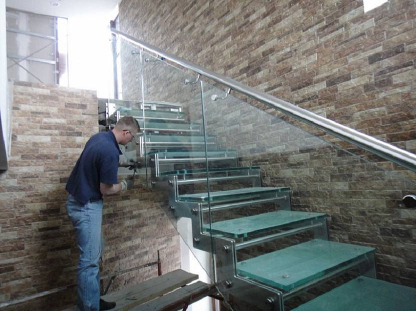 Лестница из стекла, обрамлённая стоечным ограждениемИсточник прорабофф.рф