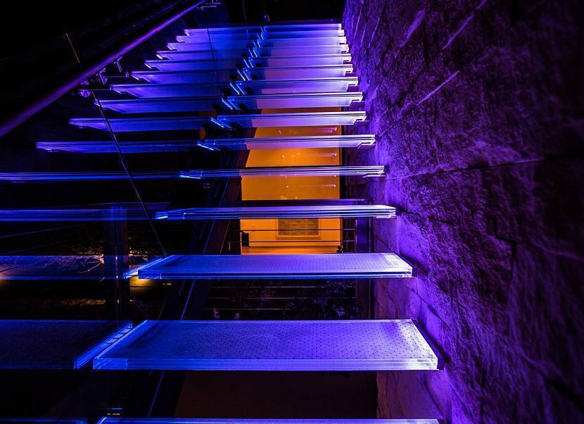 Эффектно будет смотреться лестница со светящимися боковыми элементами. Необычно осветить лестницу днем можно с помощью витражного стекла: на ступеньках заиграют разноцветные «зайчики».