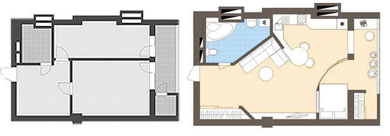 В окончании статьи мы решили привести примеры и варианты перепланировки 1-комнатной квартиры, которые были успешно согласованы. Для этого мы выкладываем согласованные планы перепланировки однокомнатной квартиры. Для каждого случая приведён план квартиры до перепланировки и план квартиры после перепланировки.Надеемся, что они подскажут какую-либо идею для Вашей перепланировки 1-комнатной квартиры в законных пределах.