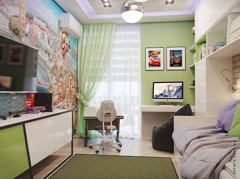 Комната подростка это уже территория проявления своих вкусов и желаний. Здесь должен появиться уголок, где ребенок сможет собираться со своими друзьями, место для размещения компьютера.