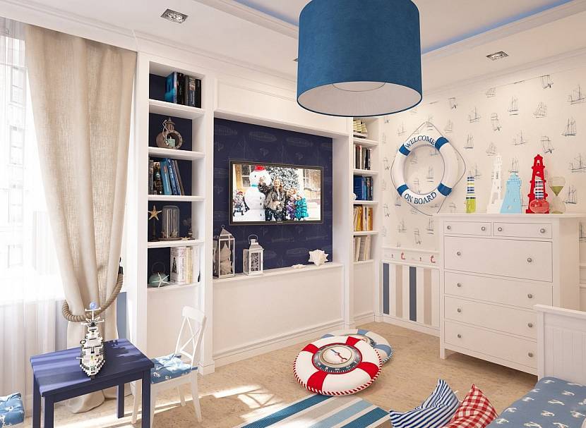 Морской стиль. Комната, оформленная в синих тонах, выглядит гармонично и подходит детям обоих полов. Для мальчиков подбирается декор, связанный с кораблями, пиратами, сокровищами, в отделке используется сине-белая гамма, темное дерево, красные акценты. Девочкам (и мальчикам тоже) подойдет стиль прибрежного коттеджа (средиземноморский), разбавленный теплыми коричневыми тонами.
