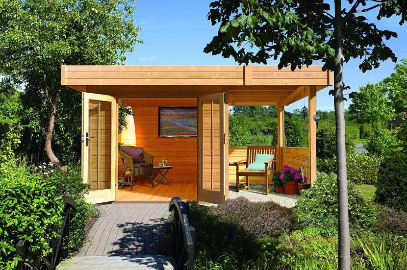 Обычно располагается недалеко от дома, представляет собой каркасную конструкцию с потолком. По сторонам можно повесить легкие шторы, чтобы частично оградить себя от насекомых и ветра с дождем. Это бюджетный вариант для небольших садовых участков.