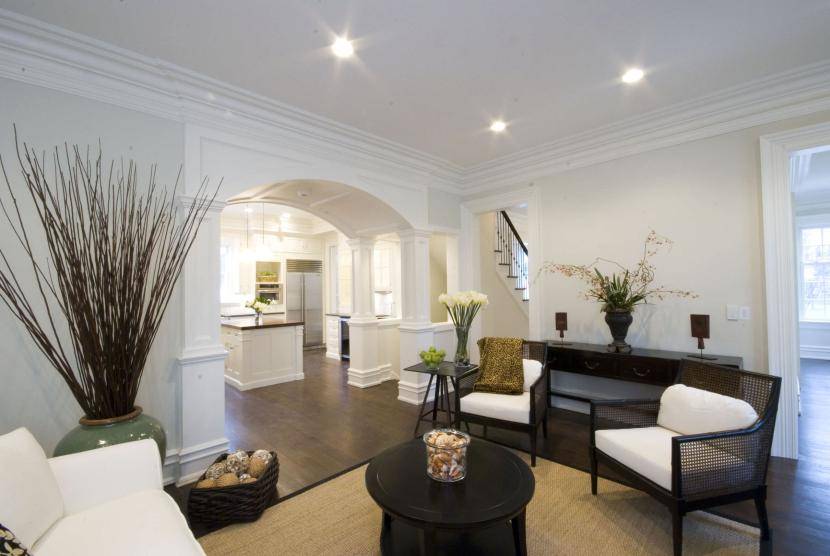 Когда на первое место выходит контемпорари, общий фон интерьера делается максимально простым и нейтральным. Классическая лепнина на стыке стен и потолка добавит текстуры и увеличит глубину прямых поверхностей. Одну или две стены можно сделать акцентными, оклеив их узорчатыми обоями в стиле эпохи Возрождения.