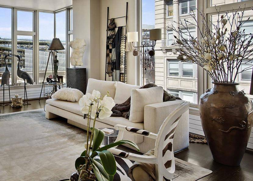 При столкновении двух стилей в интерьере рекомендуется использовать нейтральное напольное покрытие. Иначе пол будет выбиваться из общей пастельной гаммы. Обычно в ход идут ламинат, паркет или цельные доски в теплых тонах. Нейтральность оттенков восполняется богатой текстурой: персидскими коврами, шкурами, полотнами из сизаля и шерсти.
