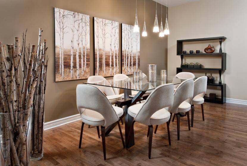 Современный обеденный стол удачно дополнят стулья, обитые тканями эпохи Возрождения. В качестве альтернативы используйте традиционную мебель и сочетайте ее с брутальным освещением в индустриальном стиле. Деревянные панели на стенах и натуральный текстиль визуально согреют строгий и холодный контемпорари.