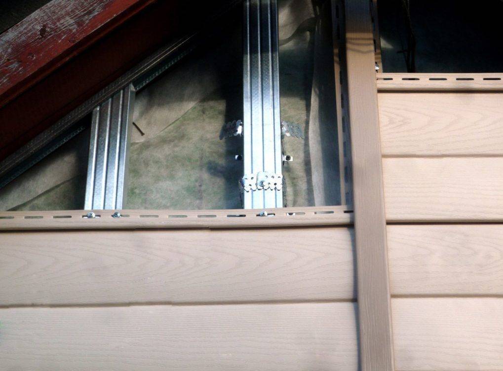 Вентилируемые зазоры, разделяющие материалы с разными теплотехническими характеристиками, создают установкой бруса на поверхности из кирпича или пенобетона. Обшивку деревянных стен фронтона производят без устройства зазора, исключение делается в случае наличия больших неровностей основания, которые корректируют сооружением фальш-стены.