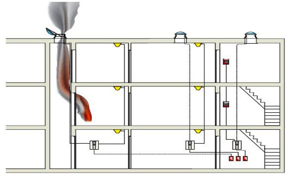 - Клапан дымоудаления, смонтированный в зоне очага огня, автоматически переходит в открытое положение.