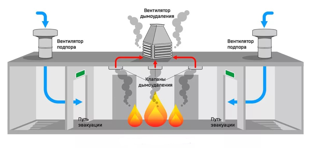 В этой безвыходной ситуации нам и приходят на помощь системы дымоудаления и подпора воздуха при пожаре.