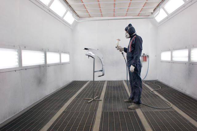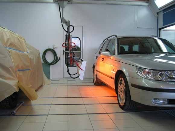 Помещение для покраски автомобиля должно хорошо освещаться. При этом светильники должны быть расположены не только на потолке, но и на стенах, обеспечивая боковое освещение.