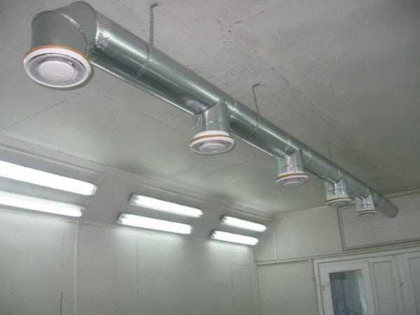Это далеко не второстепенная компонента покрасочного комплекса, в задачи которой входит отвод наружу загрязнённого воздуха и приток свежего. В качестве труб необходимо использовать только жаростойкие изделия, пластик для этих целей не подходит. Вам потребуется также утепление вентиляционных труб.