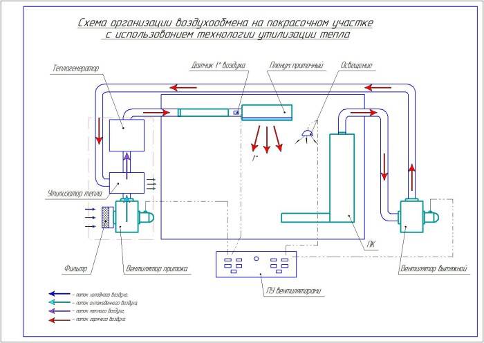 Устройство и схема вентиляции зависит от вида системы и ее особенностей. Одномоторная система воздухообмена подразумевает верхнюю принудительную подачу воздуха, за счёт чего происходит осаждение тумана с краской вниз к вытяжным элементам.