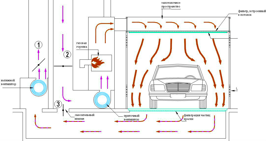 В идеале это должна быть отдельная камера, но в виду дефицита места в помещении роль сушилки ложится на плечи системы вентиляции. Она должна уметь работать в двух режимах: покраски и сушки.