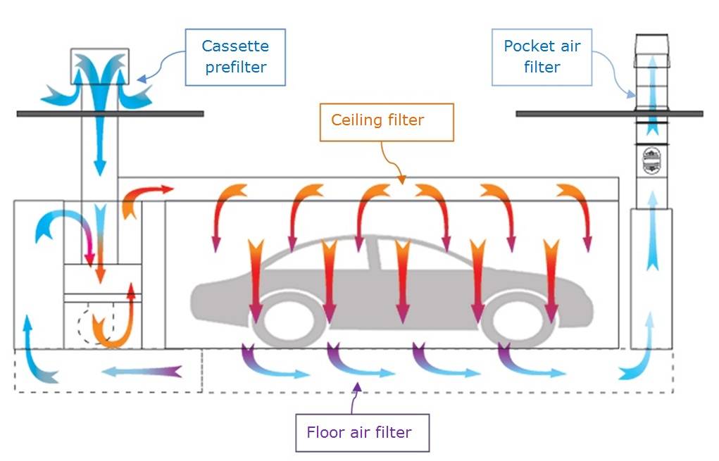 Система воздухообмена в окрасочной камере в обязательном порядке оснащается фильтрующей системой как на приточном, так и на вытяжном участке. С ее помощью из поступающих масс удаляется пыль. На выходе, из отработанных газов удаляются красящие частицы, с помощью специальных краскоулавливающих установок.