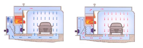 Это наиболее оптимальная система для покрасочного бокса. С ее помощью можно менять микроклимат в помещении для режимов покраски, сушки, работать с крупными кузовами и отдельными деталями. При правильном расчете в помещении будут отсутствовать слепые зоны, и не станет застаиваться воздух.