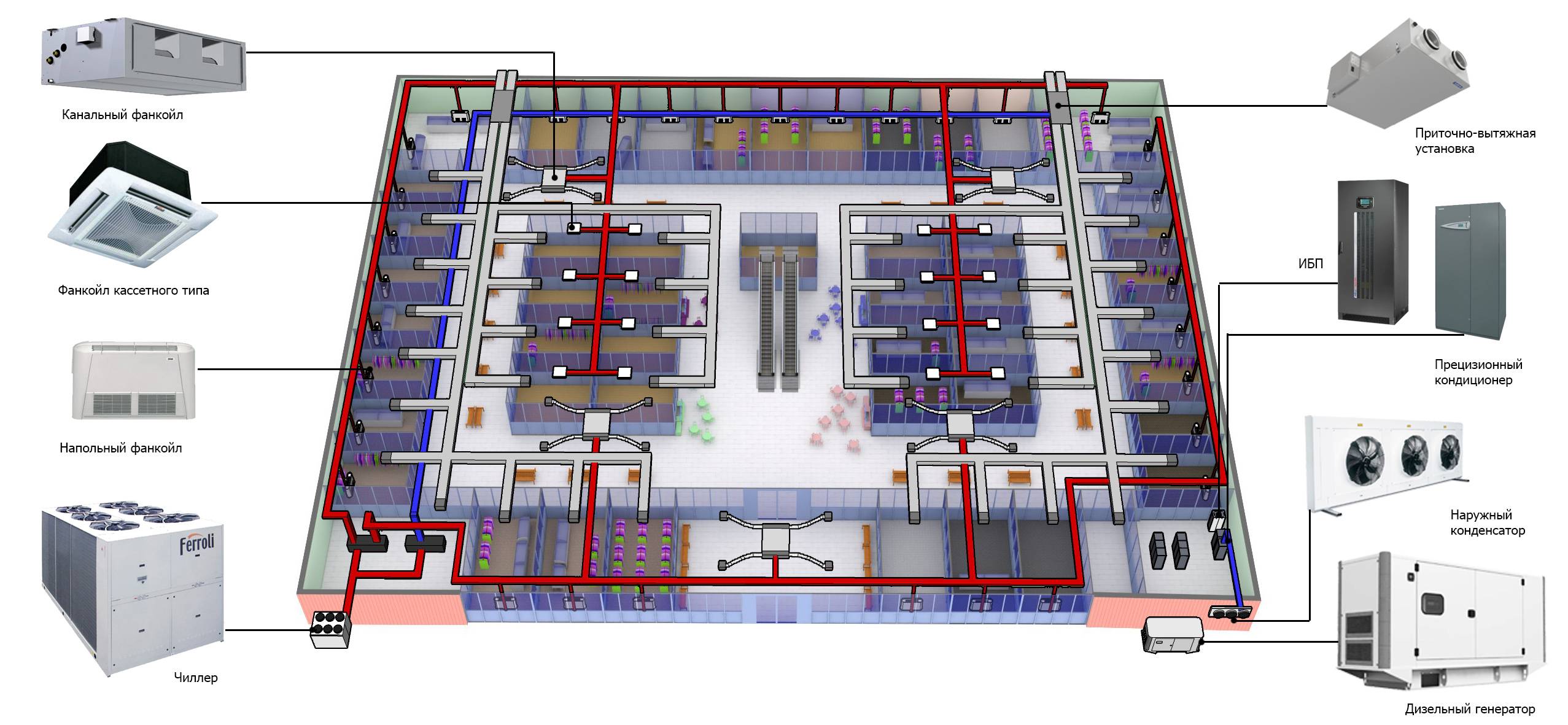 Кониционирование торгового центра осуществляется также на базе системы «чиллер-фанкойл