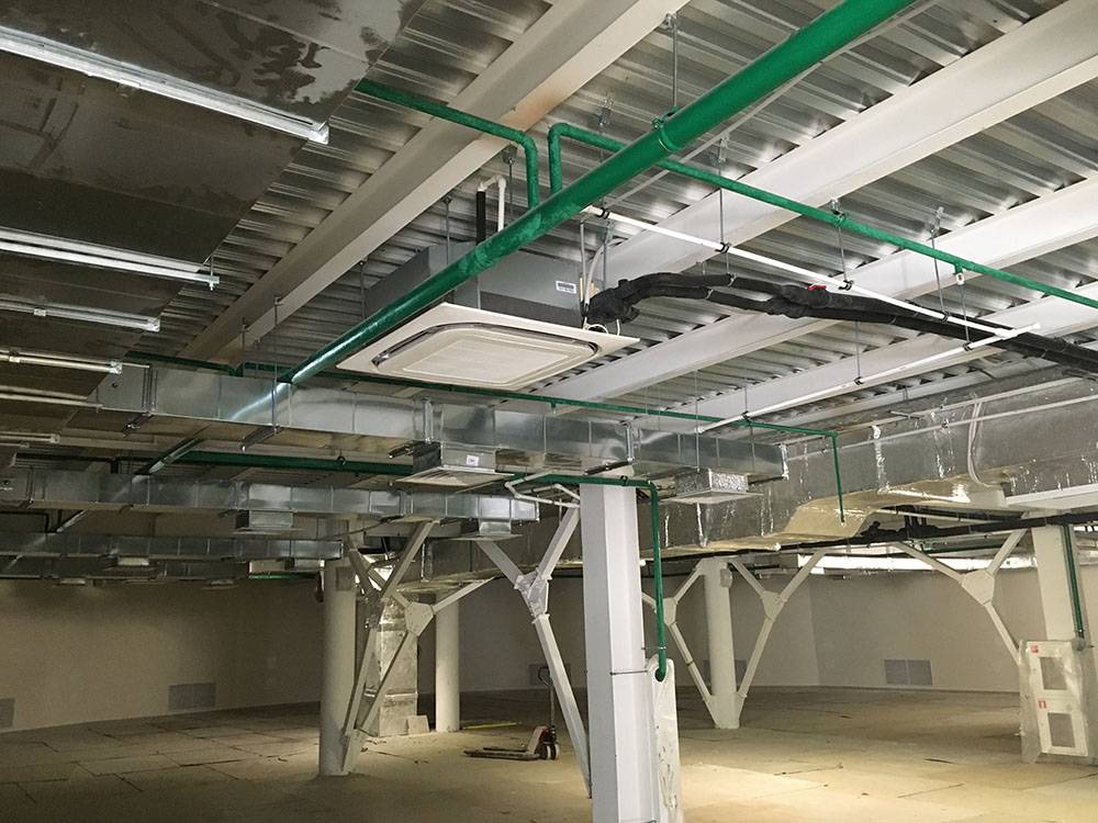 Магистральные воздуховоды систем кондиционирования воздуха, приточно-вытяжной вентиляции и магистральные тепло-холодопроводы и дренажные трубопроводы фан-койл прокладываются за подшивными потолками обслуживаемых помещений, коридоров, холлов и в коммуникационных шахтах. Воздуховоды к воздухораспределителям и вытяжные воздуховоды в помещениях рекомендуется выполнять из гибких воздуховодов и прокладывать за подшивными потолками обслуживаемых помещений, там же устанавливаются вентиляторные теплообменники (фан-койл) и прокладываются трубопроводы тепло-холодоснабжения и дренажные линии, подсоединяемые к фан-койл.