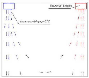 При использовании смешивающей модели входной и выходной каналы располагаются в разных секторах помещения.