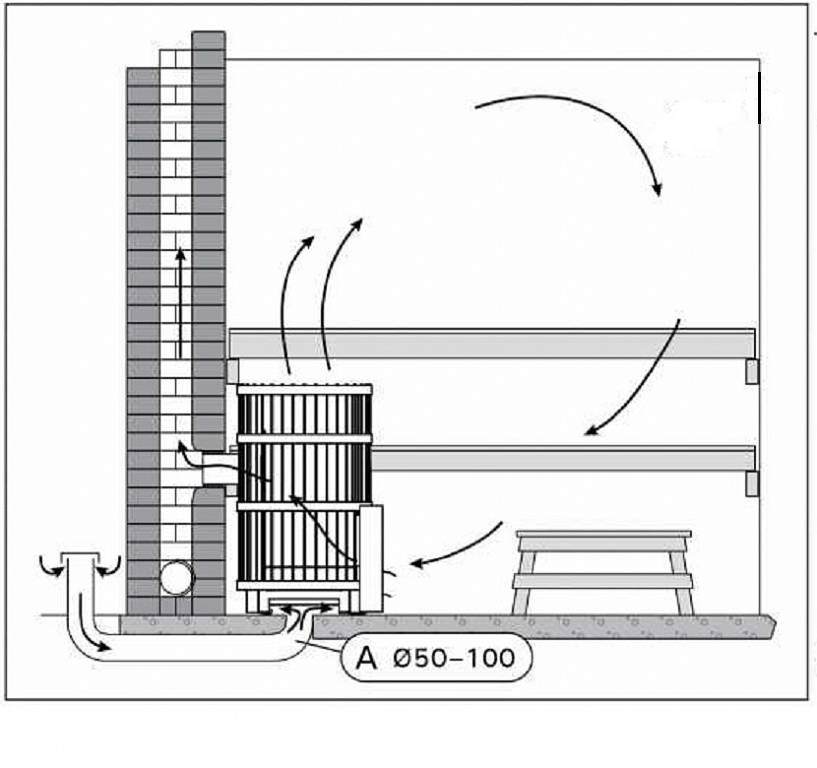 Основой при таком виде естественной вентиляции является печь. В поддувало затягивается нагретый воздух и через печную трубу выводится наружу. Чтобы в парилку поступал свежий поток воздуха, в нижней части двери делают щель 5–10 мм. Или просто неплотно закрывают дверь. Печку при этом устанавливают ближе к ней. В срубовых банях приток возможен из-за неплотно сложенных нижних венцов.
