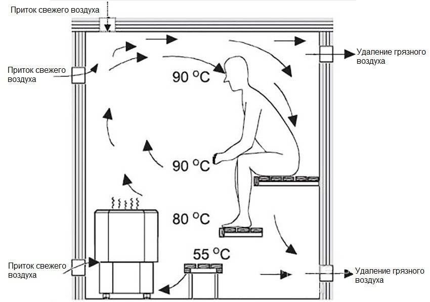 Но в ней необходимо поддерживать комфортную для приема процедур температуру, причем так, чтобы не образовывались сквозняки, и не было резкого перепада от жары на полке до холода на полу. Для этого воздушные потоки должны двигаться по определенной траектории, которую задают посредством размещения приточных и вытяжных отверстий в конкретных местах.