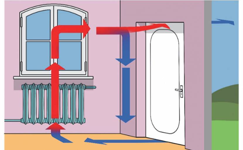 Замещение воздуха в помещении происходит благодаря постепенному подъему подогретых воздушных масс вверх к потолку в направлении вытяжного отверстия, выведению их наружу и поступлению аналогичного объема холодного свежего тяжелого воздуха с улицы через приточное окно.