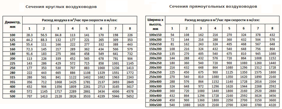 В нашем примере расход воздуха составляет 48 м³/час, скорость потока примем среднюю — 4 м/сек (компромисс между шумом и размерами воздушного канала), тогда сечение получается из расчета: