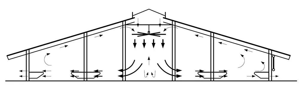 Рабочей основой такой схемы являются осевые оконные вентиляторы, устанавливающиеся в стенные проёмы по обеим сторонам сооружения, а также вентиляторы для крыши (или шахты) с утеплением. В них встроен конусообразный рассекатель воздушного потока. Схема работает по типу «поступление воздуха через кровлю — вывод через окна», позволяя существенно снизить расходы на систему отопления.