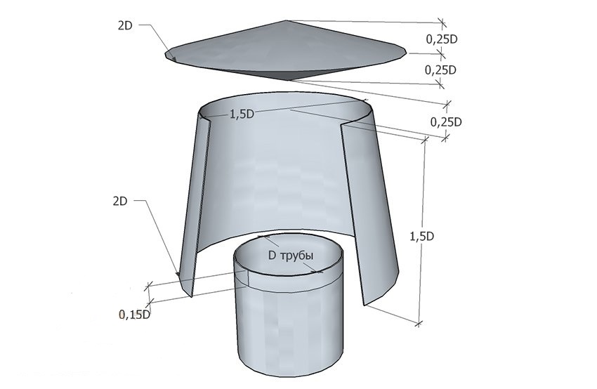 Для его установки также требуются детальные расчёты. Если вы знаете диаметр трубы, то воспроизвести их очень просто. Чтобы рассчитать ширину колпака, умножьте диаметр на 2, высоту — умножить тот же параметр на 1,7. Ширину диффузора можно узнать, умножив диаметр на 1,3.