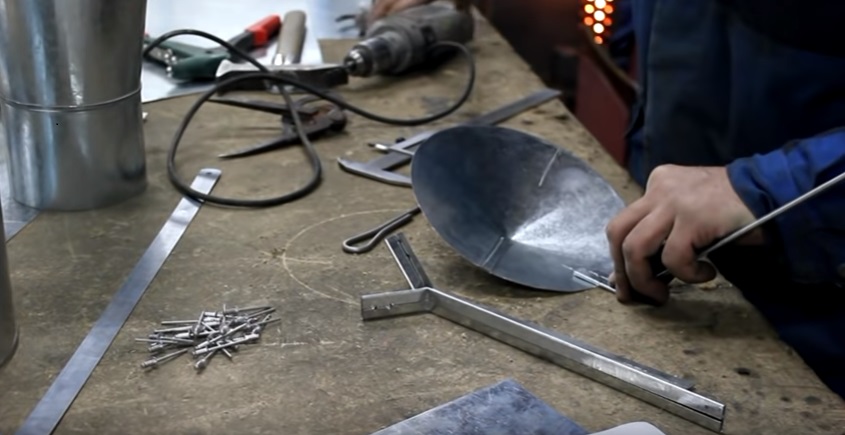 Ножницами по металлу вырезают заготовки. Также вырезают металлические полосы для соединения деталей. Для скрепления просверливают отверстия, закрепляют болтами и заклёпками.