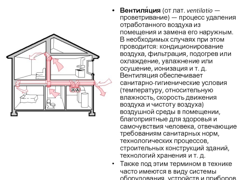 Вентиляция — это совокупность устройств и мероприятий для обеспечения нормального воздухообмена в помещениях. Исходя из этого определения, различные виды систем вентиляции классифицируются следующим образом: