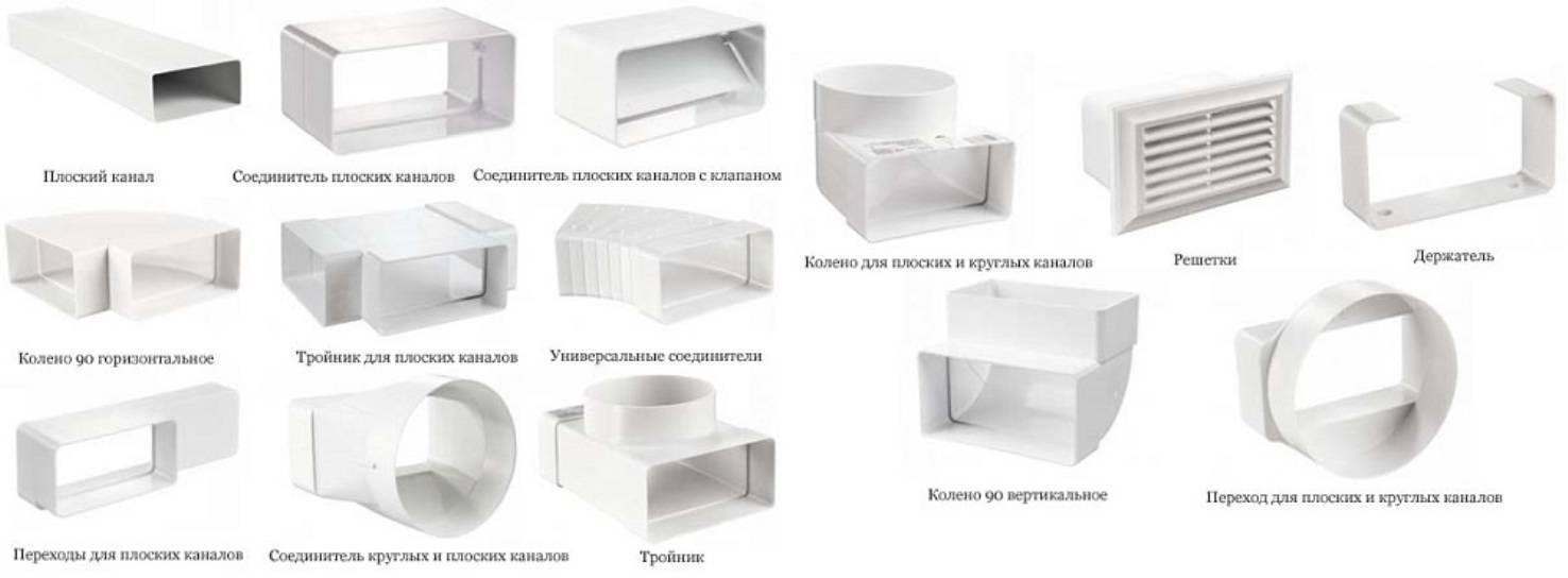 - Воздуховод. Труба прямоугольного сечения длиной 0,5, 1 или 2 метра. Устанавливаются под потолком, не требуют лишнего пространства.