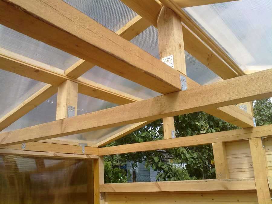 Крыша может быть одно- или двускатной. Во втором случае скосы располагают вдоль стен основного строения. Стропила подбираются достаточно мощные, чтобы кровлю не продавило снегом.