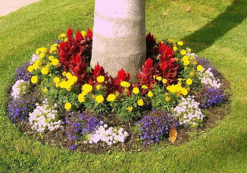 На больших ровных участках создают ковровые клумбы из почвопокровников одинаковой высоты. А вокруг древесного ствола можно разбить круговой цветник.