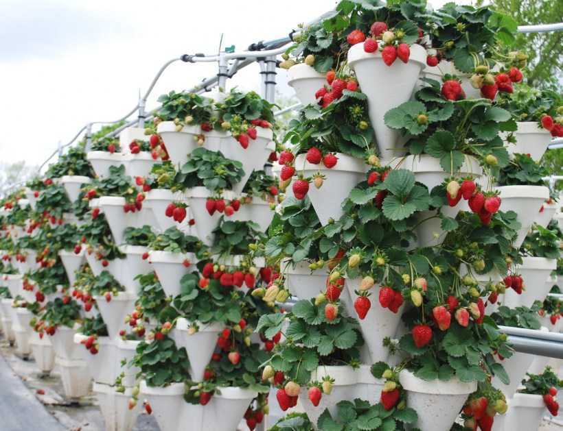 В последнее время стала популярной ремонтантная клубника с использованием вертикального способа посадки. С подвесными кашпо, расположенными в несколько ярусов, клумба для клубники станет главным местом обитания домочадцев.