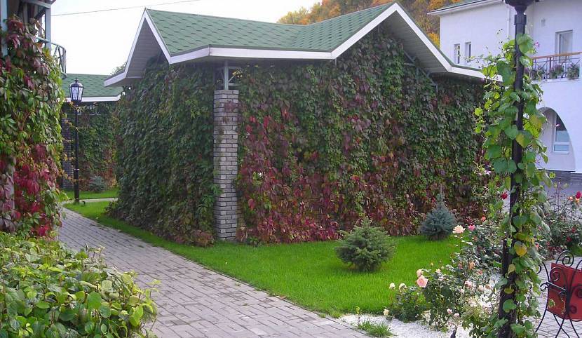 В вертикальном озеленении сада используют плетущиеся культуры. Наиболее неприхотливым является девичий виноград. Вид в течение сезона способен оплести небольшую перголу, арку или шпалеру. Зеленая листва к осени приобретает насыщенный красный цвет. Живой декор направляют в сторону опоры, обрезая весной и осенью лишние плети. Во время вегетации растение обильно поливают, удобряют и рыхлят грунт.