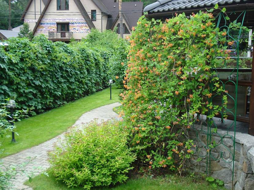 Жимолость – красивое вьющееся семейство, которое применяют в вертикальном озеленении. Сорта «Каприфоль», «Тельмана» относят к листопадным лианам, цветущим в мае-июле. К концу сезона на ветках появляются оранжевые декоративные (несъедобные) ягоды. Гибрид «Джиральда» не сбрасывает листву на зиму, оставаясь до весны зеленым. Культура предпочитает расти в хорошо освещенных участках, не любит кислую почву. В течение вегетации садовый декор обильно орошают, регулярно подкармливают органикой. Чтобы придать кусту форму, нужна обрезка.