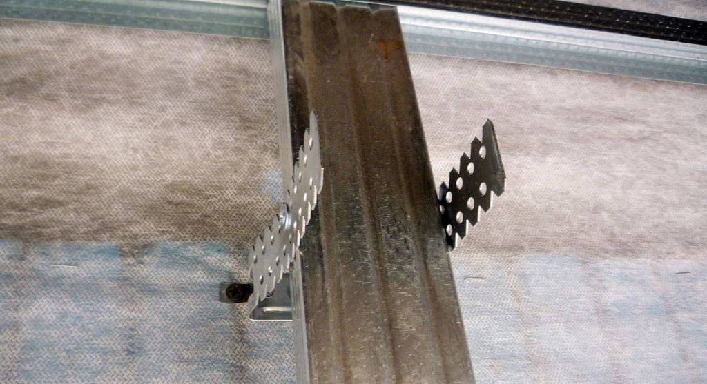 - Так как крепление профиля на подвесах может быть не достаточно жестким, для придания обрешетке дополнительной прочности между планками могут быть закреплены перемычки из этого же профиля.