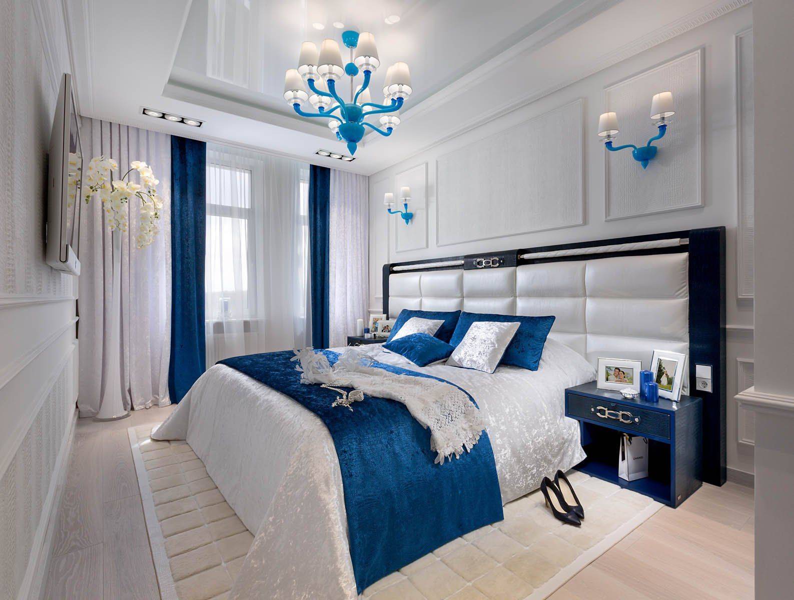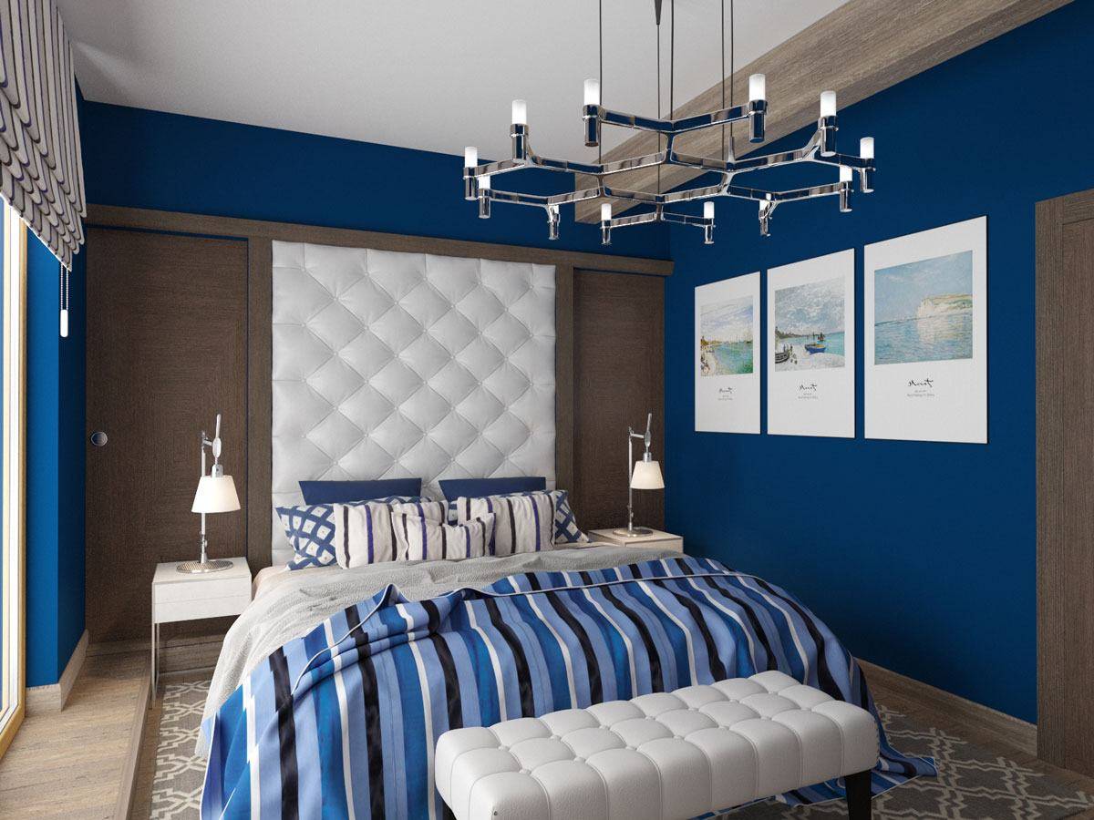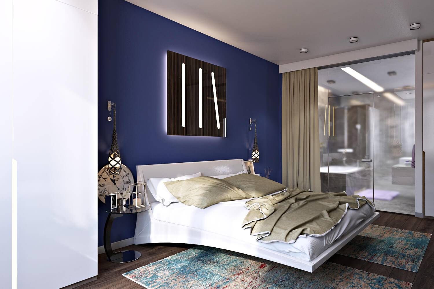 Синий цвет в интерьере спальни выглядит особенно благородно. Он не только подчеркивает эстетическую составляющую, но и часто является акцентом оформления. Кроме того, выбирая такое нетипичное решение, вы сделаете значительный вклад в собственный качественный отдых.