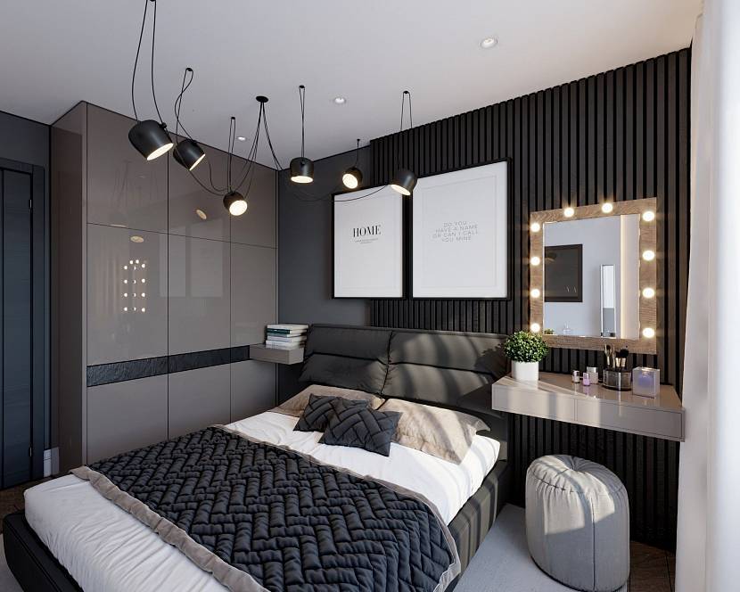 Но выполняя дизайн спальни 13 кв м в темных тонах, не нужно забывать об освещении. Оно способно исправить многие дефекты комнаты, в том числе и слишком темные углы. Поскольку в маленькой комнате большие люстры крайне нежелательны, то остановиться нужно на небольших бра. Следует разместить их равномерно по помещению, чтобы они освещали все функциональные зоны. Например, место с туалетным столиком и гардеробную.