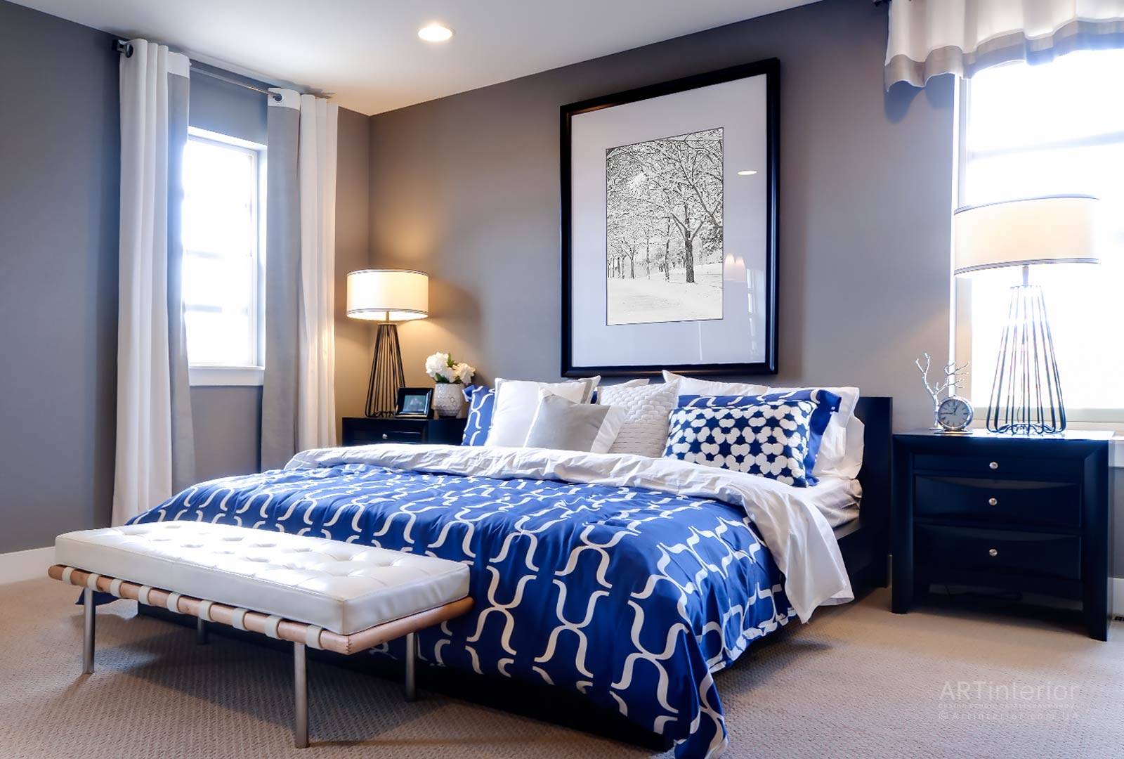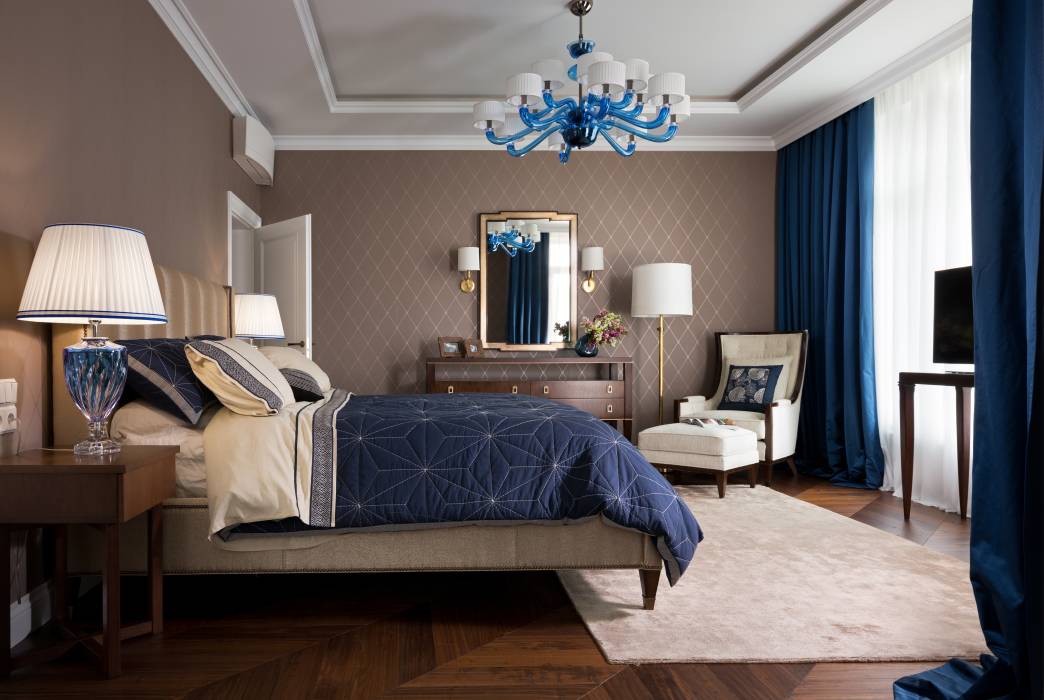 Что касается сочетания с другими оттенками, то оно также может быть разным. Комбинируя синий и белый или бежевый цвет, получится создать более легкое и воздушное пространство. Если же вместо него использовать серые тона, то это сразу же сделает помещение сдержанным, лаконичным. Любителям классических интерьеров определенно понравится коричнево-синее оформление спальни. Оно выглядит благородно и не требует большого количества мебели и декора. В свою очередь, если добавить помещению золотые акценты, сразу же получится более изысканный стиль. Его выбирают семьи, которые не боятся пробовать что-то новое в интерьере.